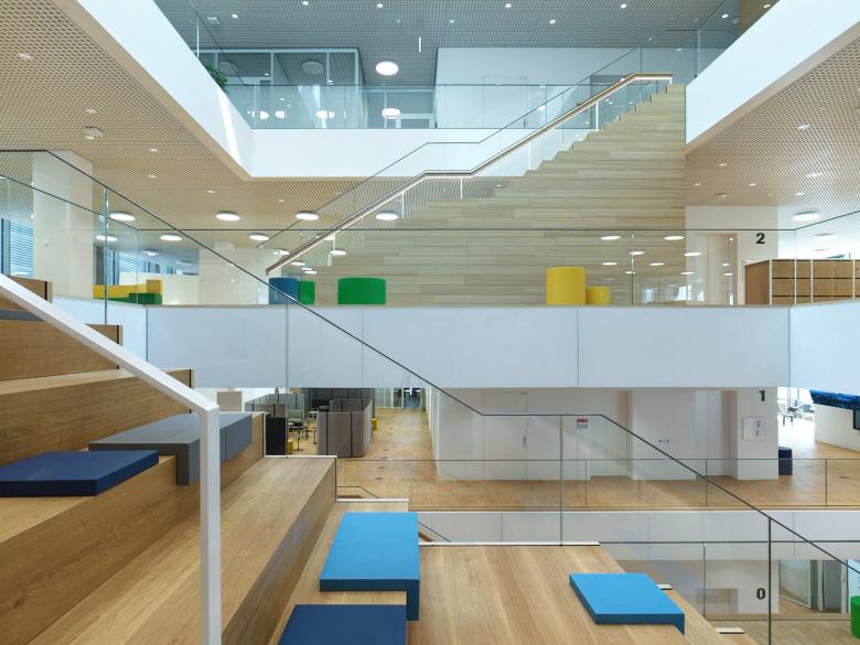 Beleuchtete Handläufe begleiten die Treppen im Atrium und bringen auch bei den als Sitzstufen ausgebildeten Volumen viel blendfreies Licht. In die fein perforierten Metalldecken integriert verteilen Deckeneinbauleuchten ein weiches Licht in die Erschliessungsbereiche und belichten auch die Atrien. Die Büroräume werden durch grosse, bildschirmgerechte Pendelleuchten erhellt. Diese sind unter der Metalldecke platziert und spielen dadurch einen wichtigen Part der Rhythmisierung der Decke.