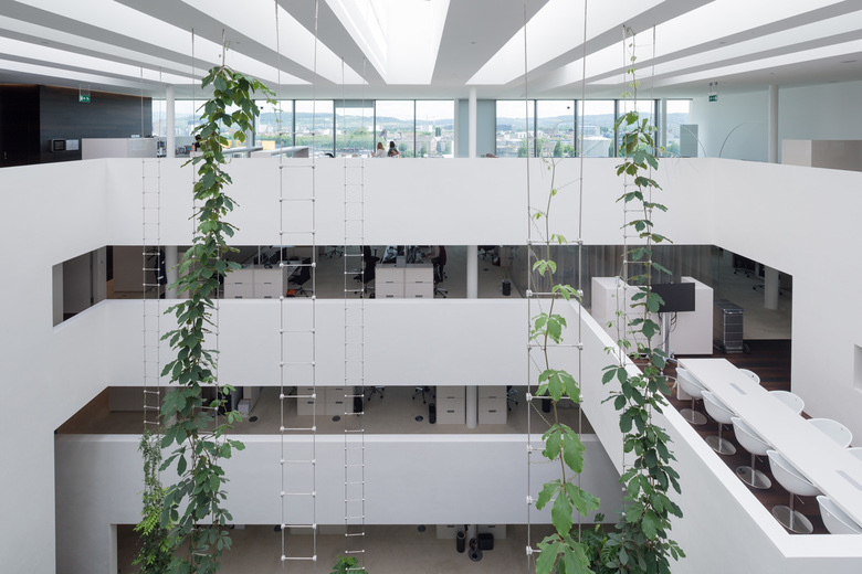 Die in die metallenen Abhangdecken integrierten Lichtlinien erzeugen ein gleichmässiges, blendarmes Arbeitslicht. Die Lichtbänder, ausgestattet mit sogenannten „Batwing“-Reflektoren, die die Bildschirmgerechtigkeit erzeugen, sind auf die Gebäuderaster ausgerichtet. Durch eine hohe Effizienz der Leuchten, kombiniert mit einer breitstrahlenden Lichtcharakteristik wird eine sehr gute Wirtschaftlichkeit erreicht.