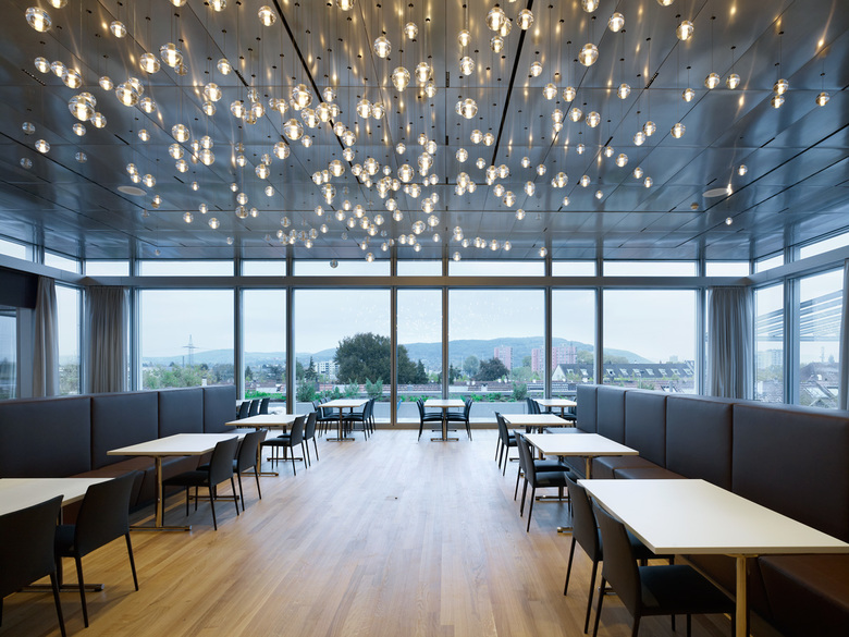 In den Speisesälen wurden zur Grundbeleuchtung grosse, gerundete Pendelleuchten eingesetzt, welche den Raum zentrieren und ihm eine neue Massstäblichkeit geben. Das Lichtobjekt kann auch bei Abendveranstaltungen als Stimmungbeleuchtung oder in der Dämmerung als Beleuchtung für die Gebäudefernwirkung eingesetzt werden.