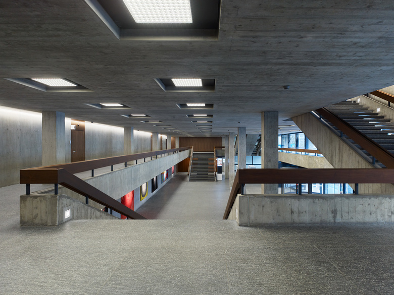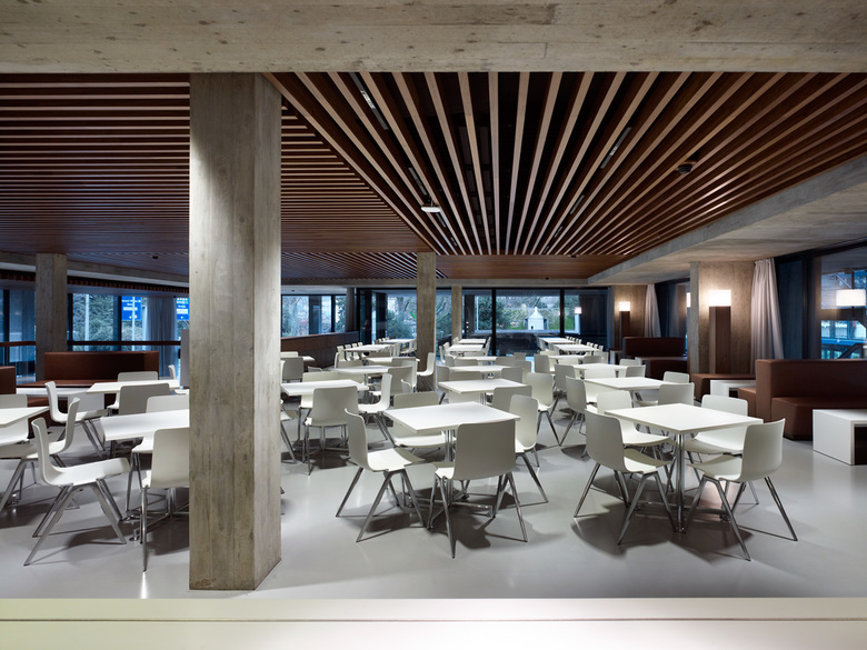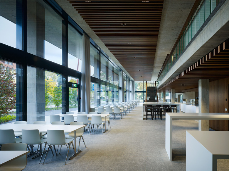 Im zweigeschossigen Bereich der Cafeteria sollen die Deckenleuchten typgleich wie im Speisesaal zum Einsatz kommen. Damit ist eine einheitliche Erscheinung gewährleistet. Die freistehende Kaffeebar erhält Licht über die Deckenleuchten. Die freistehenden Verkaufskorpusse sind über Deckeneinbauleuchten in der abgehängten Decke kräftig angestrahlt. In der Galerie sind Leuchten in der aus Lamellen ausgebildeten Decke verteilt und erzeugen eine angenehme Lichtstimmung. Helle, niedrige Sitzmöbel und ein heller Bodenbelag reflektieren das Licht gut in den Raum. Zudem sind in den Bereichen zwischen den breiten Stützen fest montierte Lichtstelen vorgesehen, welche diese Zonen betonen.