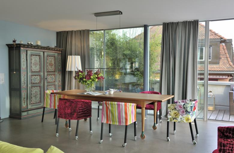Viel Farbe, eine stilvolle Kombination von antiken Möbeln und modernem Design sowie ein grosser Aussenraum machen die Attikawohnung im Kreiss ll in Zürich zu einer Oase.