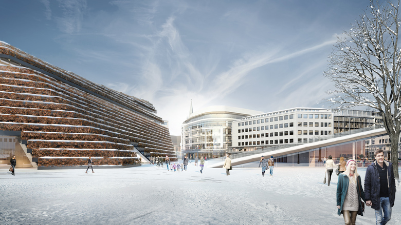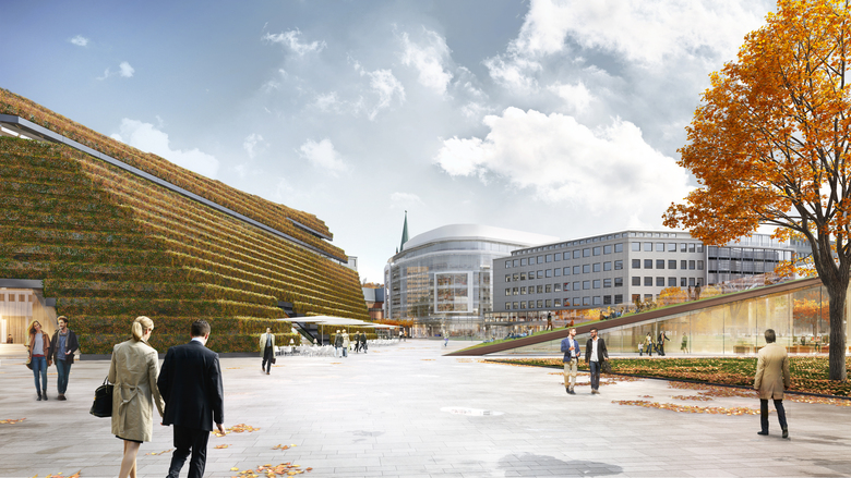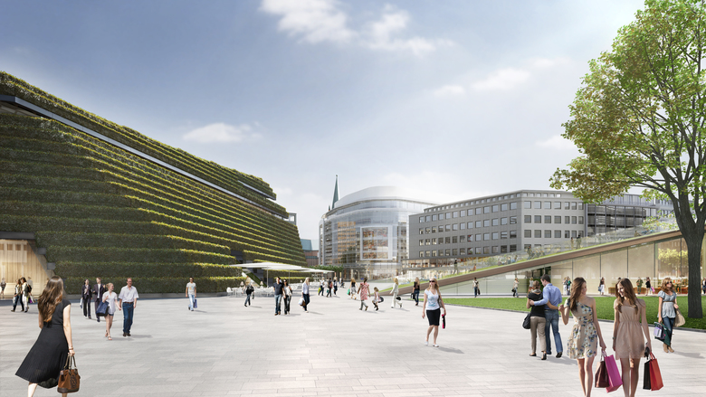 Die zuvor geschlossene Betondecke des Gustaf-Gründgens-Platz erhält unter anderem durch Bauminseln, Sitzmöglichkeiten, gastronomische Angebote und ein innovatives Beleuchtungskonzept neue Vitalität.