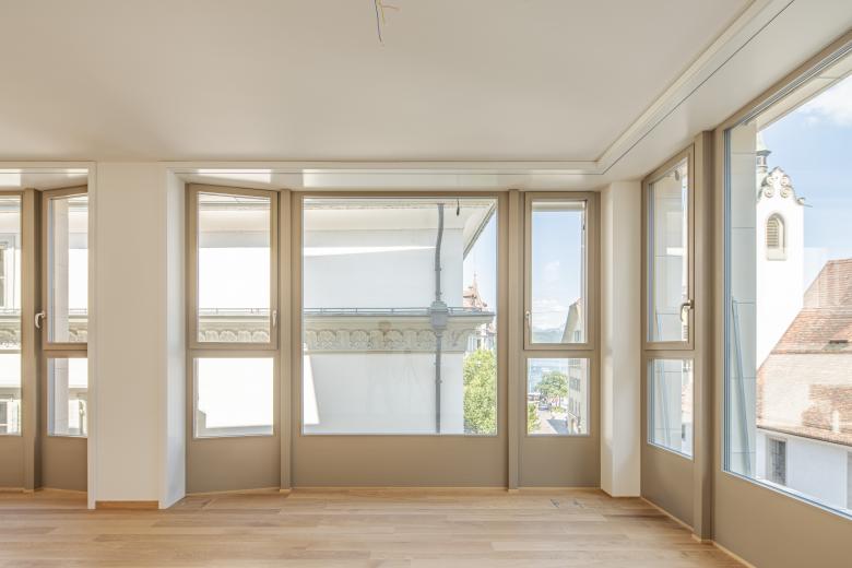 Die schmucke Fassade ist elegant repräsentativ und zeigt an der Hauptgasse ein modernes Gesicht, dagegen ist der rückwärtige Hausteil zum Hof in seiner Gestalt profaner. Hier gelangt man zu den Wohnungen der oberen drei Etagen. Verlässt man im zweiten Obergeschoss das hintere Treppenhaus, betritt man eine grosse Dachterasse mit einer Laubengangerschliessung für die oberen Geschosse. Da private Balkone fehlen, bilden sie den kollektiven, familiären Aussenraum für die 11 Wohnungen. Im zweiten Obergeschoss sind vier individuell geschnittene Wohnungen mit streng gegliederten Wohnräumen zur Kapellgasse und einer informelleren Seite zum Hof situiert. Im dritten Obergeschoss reichen Maisonettewohnungen bis unters Dach.