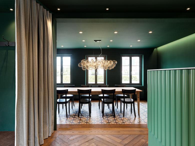 Am grossen Tisch im «Parkett» sitzt man nah am Geschehen und bietet zusätzlich einen neuen Lieblingsort, in dem der neuinterpretierte «Stammtisch» zum Entspannen und Geniessen einlädt.