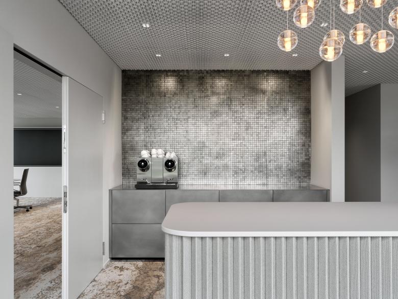 Mit dem Ziel, ein charaktervolles und unverwechselbares Design für die Konzernleitung zu gestalten und eine deutliche Verbindung zur «Sky Lounge» im Visitor Center herzustellen, haben wir auf den Einsatz von Metalloberflächen gesetzt. Die monochromatische Gesamtkomposition aus Aluminium, Flüssigmetall und Edelstahlmosaik, harmonisch abgestimmt mit weichen Textilien sorgen für Ruhe und Klarheit und verhelfen zu einer durchschlagenden Eindrücklichkeit mit hoher Aufenthaltsqualität und wohnlichem Charakter.