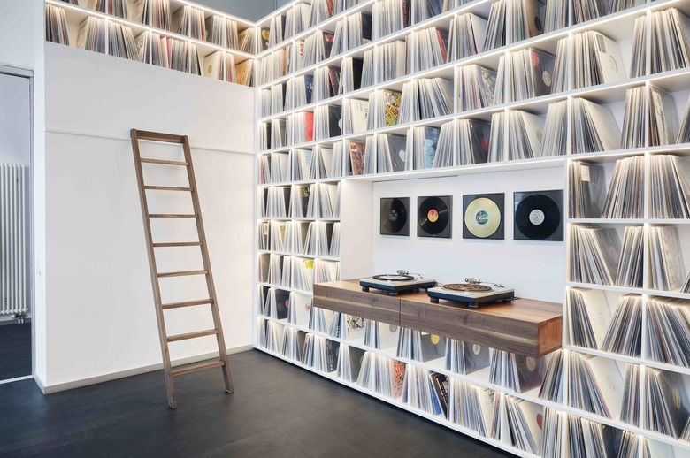 besonders zur Geltung. 24 mm starke Tischplatte wurden verbaut und 18 für die Lichtbänder notwendigen Trafos fanden diskrete Eckpositionen, so dass sie bei der Gesamtwirkung des Raumes nicht ins Gewicht fallen. Das kubische Element scheint dabei zu schweben und schafft für den Plattenspieler einen zentralen Ort. Hier finden sich zwei integrierte Schubladen, in denen etwa Utensilien zur Plattenreinigung untergebracht werden können. Durch diese Nische entsteht nun ein Raum, der zur Präsentation von Lieblingsplatten genutzt werden kann. Und auch an die Zukunft wurde gedacht: Der 4,30 m hohe Raum hat durch die Planung eine imposante Kapazität für bis zu 50.000 Schallplatten erhalten. Das sollte für ein paar Jahre reichen.