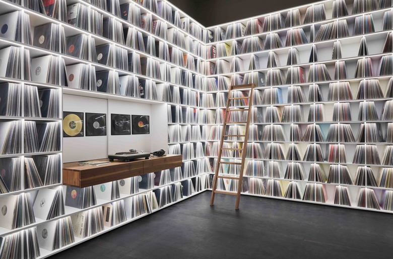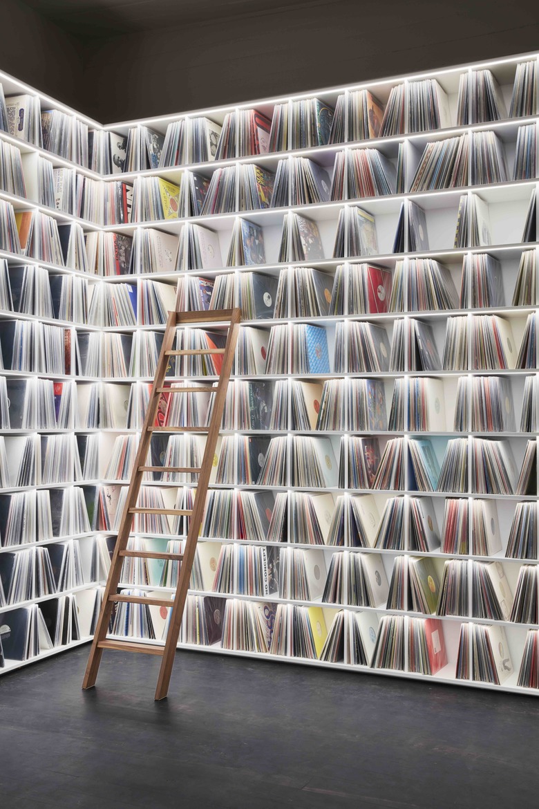 ihn zum «Record Room». Das festgelegte Weiss für die Regale hat zwei wichtige Konsequenzen zur Folge: Zum einen wirkt der Raum dadurch hell und das Licht der LED Bänder (400 Laufmeter) wird von den Innenflächen der Regaleinheiten reflektiert. Zum anderen kommen so die Farben und Grafiken der Albumcover