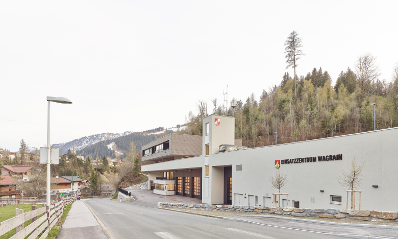 Entlang der Bundesstraße Richtung Flachau / Altenmarkt erwächst aus der hügeligen Landschaft ein neues attraktives Landmark in Form eines Einsatzkräftestützpunktes. Selbstbewusst in seiner architektonischen Ausformulierung präsentiert sich der neue Standort der Wagrainer Feuerwehr, Bergrettung und Polizei.