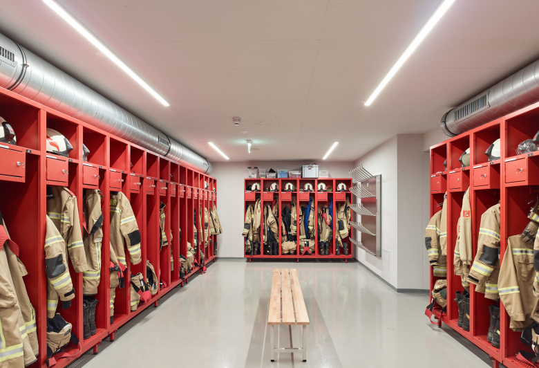Dadurch entfällt der Bau einer Tiefgarage und man erzielt gleichzeitig eine klare funktionelle Trennung auf Höhe der Zufahrt. Die Mitglieder der Feuerwehr und der Bergrettung werden nach unten und die Polizeibediensteten und deren Parteien nach oben geleitet.