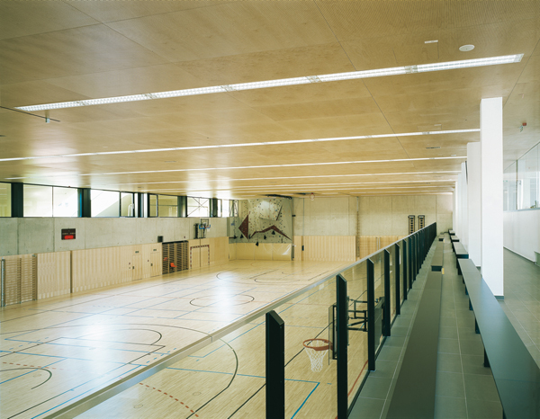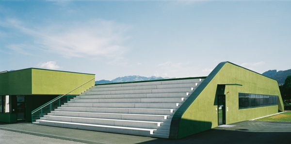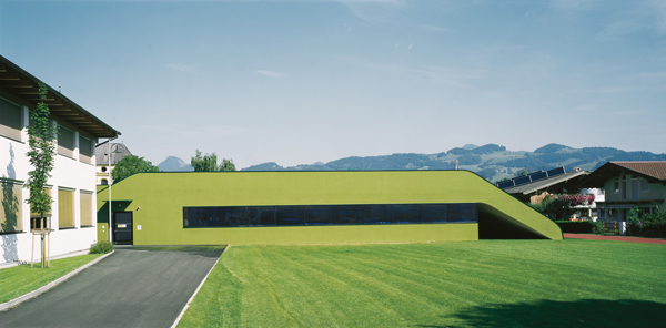 Um den attraktiven Grünraum des Gauplatzes weitgehend zu erhalten, wird die Landschaft über die Sporthalle gestülpt, anstatt das Gebäude auf das Geländeniveau zu situieren. Durch diese Maßnahme und die größtenteils unterirdischen Baumassen, integriert sich das Gebäude sehr sensibel in die bestehende Struktur.