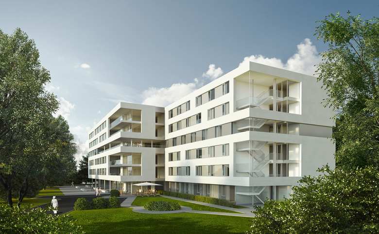 Der längliche 6-geschoßige Baukörper ist Nord-Süd ausgerichtet und greift die Achse des Nachbargebäudes auf. Die Entwicklung in die Höhe garantiert einen maximalen Freiraum für spätere Nutzungsvorhaben. Die Haupterschließung erfolgt weiterhin über die Salzburger Straße mit einem beschränkten Mitarbeiterparkplatz im Süden. Besucherparkplätze hingegen sind mehrheitlich über die Raimundstraße im Norden anzufahren, wie auch die Rettungs- und Feuerwehrzufahrt direkt zum Haupteingang des „Zentrums für Pflege und Betreuung“ führt. Das Gebäude erhält an der gesamten Längsfassade eine Art Vorplatz, als Verbindungsweg vom Parkplatz oder als Aufenthaltszone nutzbar.