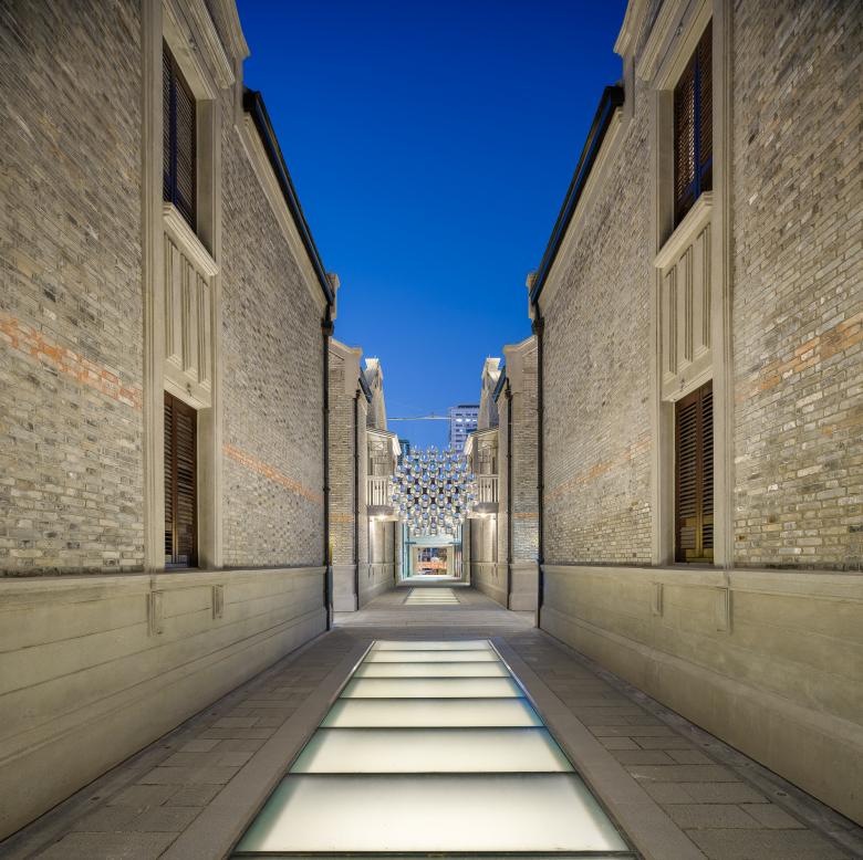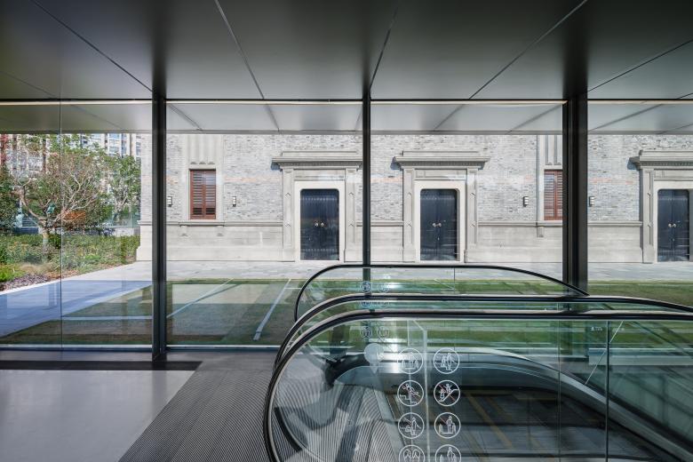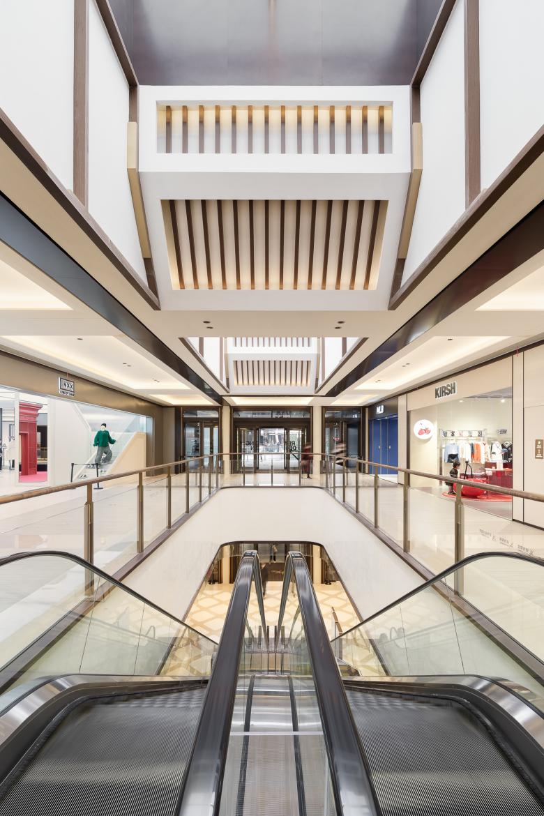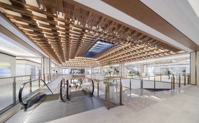 Inside the mall, two enclosed areas have been designed to physically and visually connect with the site’s significant culture heritage, Shenyu Li and Thean Hou Temple. The commercial space located directly below is succinctly integrated with the historic heritage on the ground floor and compactly locates the entrance, axis and underground public atrium. Kokaistudios' interior design team extracted elements from the structure of the traditional lilong house and apply these to the design. The combination of the glass roof windows and the lightweight wooden rafters ceiling recalled the memory of history. Designed as “a dialogue between commercial and heritage”, they integrate the conservation building with the commercial public space as a spatial technology.