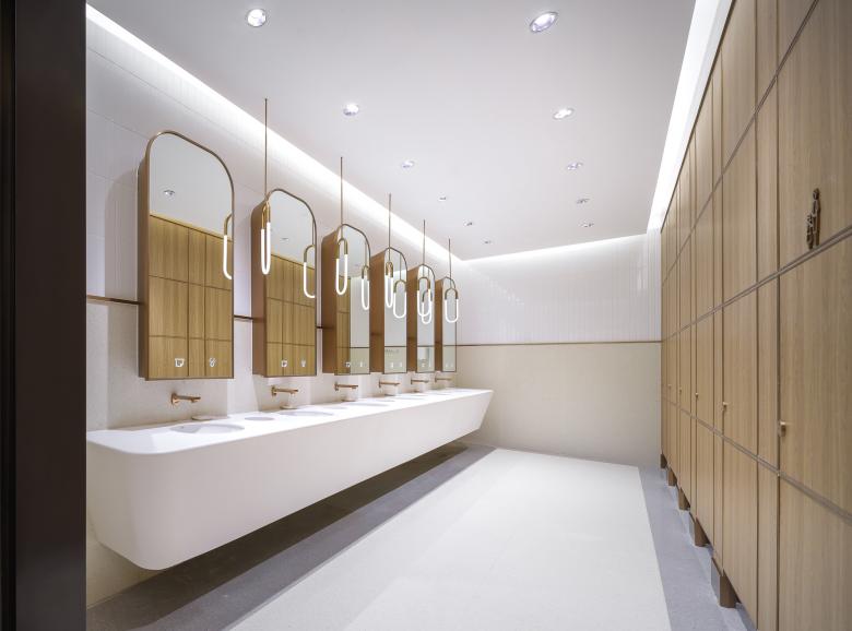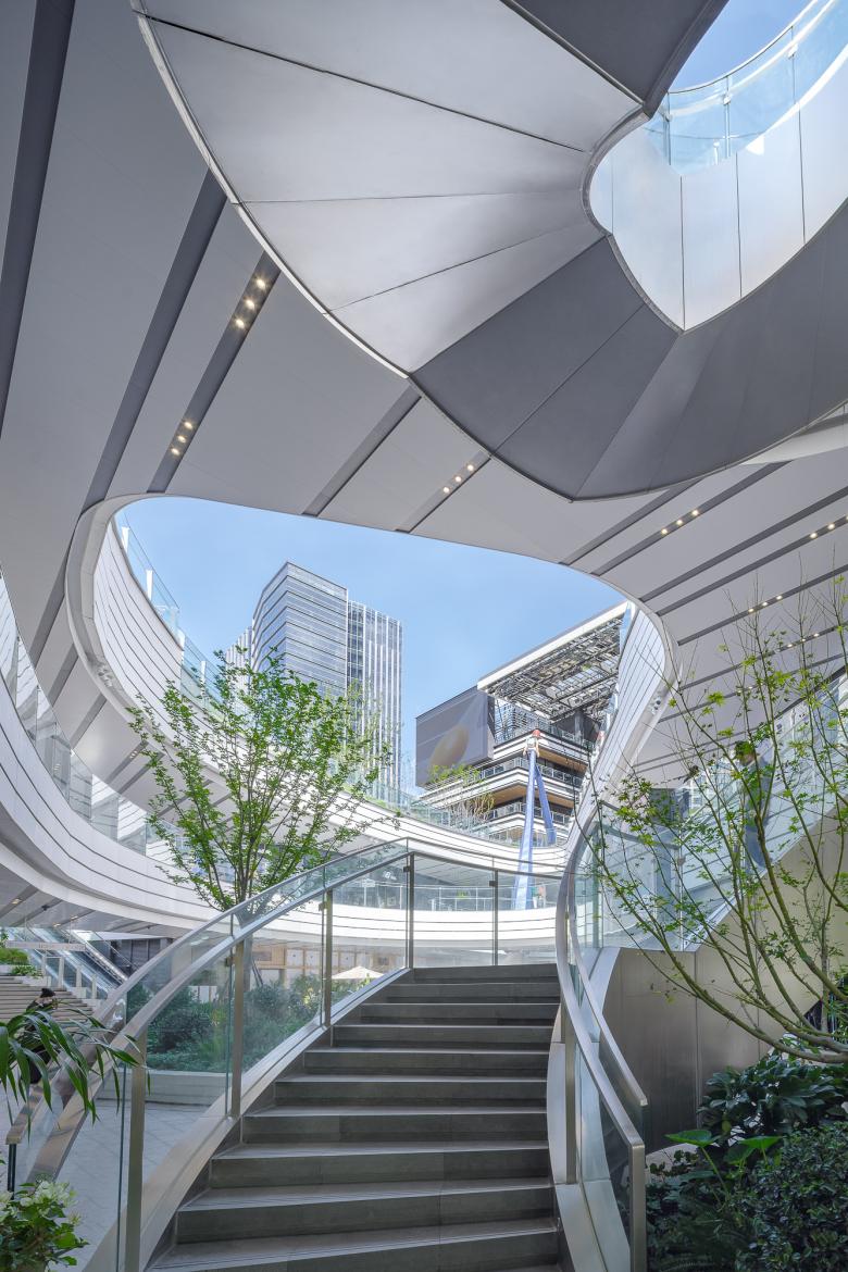 The pebble-shaped openings incorporate entrances to the underground commercial space, and are located either side of the bisecting road. Partially planted and with occasional seating areas along their route, as well as coffeeshops, they recall the gentle slopes of a valley or stepped tea fields. With escalators alongside for accessibility, entrances merge with the surrounding landscape, with only their canopies visible from the green land above. Another entrance is via the new four-floor commercial building. The structure is located next to the office tower, aesthetically uniting the site's recent phases of development through materials.