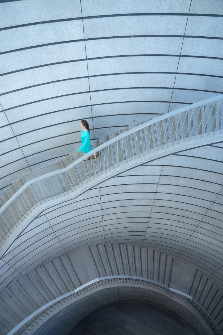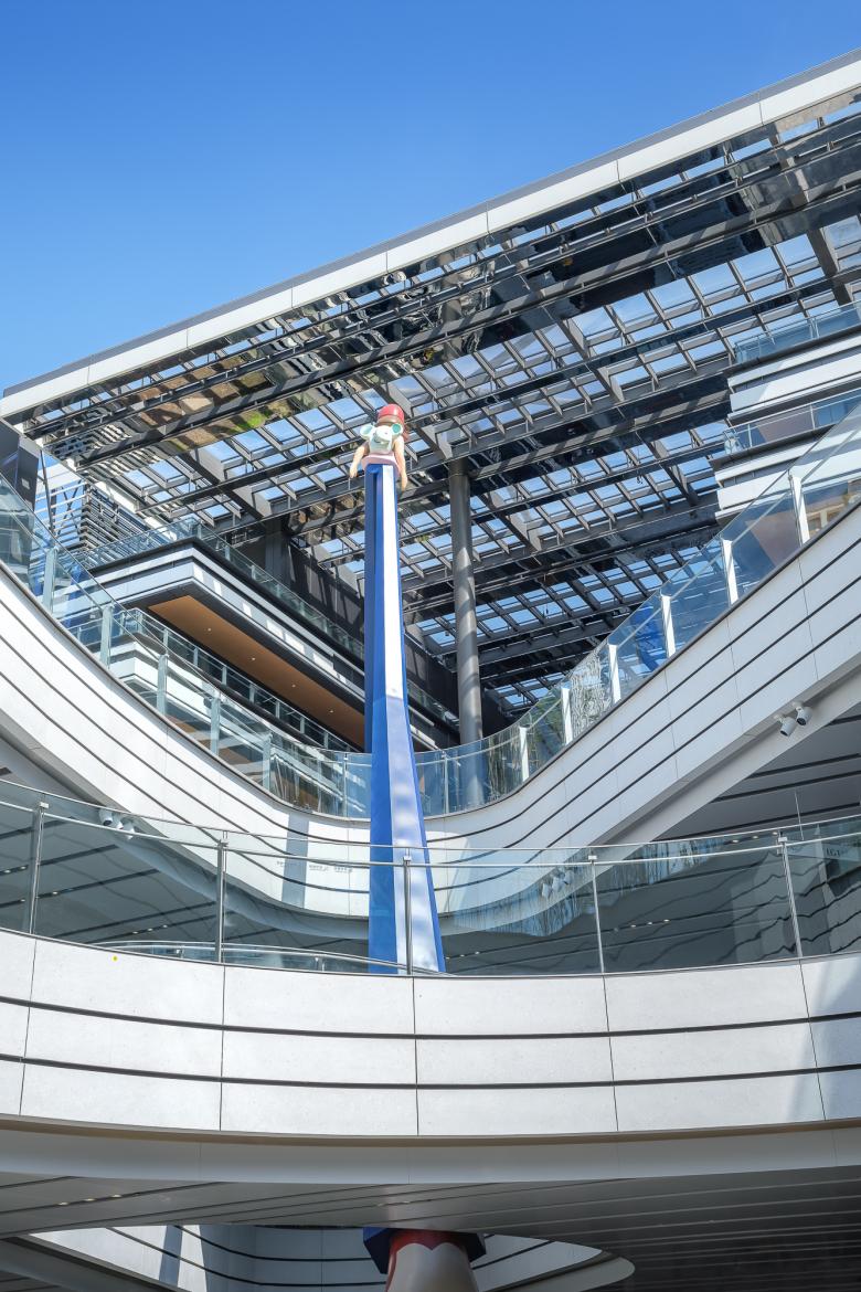 Further linking above and below is a pair of artworks by Hong Kong-based creative studio, AllRightsReserved, and German artist collective, Inges Idee. Family Orchestra, is a giant sculpture of two cartoon elephants gazing at each other, linking the ground-level green land with subterranean commercial area. Their curved the bodies, resembling a trumpet and a tuba, echo the shape of the openings. Striking a similarly playful tone, Up We Go! features a child seemingly mid-stride as he steps through the landscape and out of one of the green land’s openings. The character's elongated legs, which traverse both basement levels to emerge on the terraced slope above, create a connection between above and below.