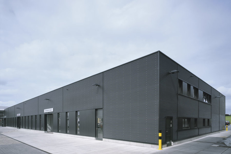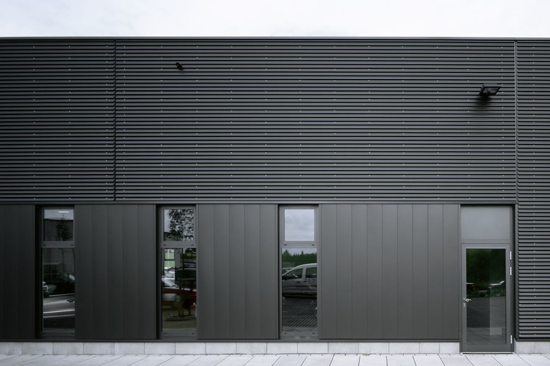 An das Ausstellungsgebäude schließt sich ein langer, schlichter Baukörper für die Spenglerei, die Lackiererei und die Sozialräume an. Seine dunkle Fassadenfarbe macht das Werkstattgebäude zu einem eleganten, ruhigen Hintergrund für die geometrisch komplexe, alufarbene Ausstellungshalle.
