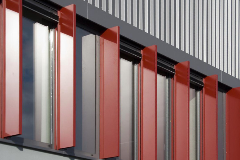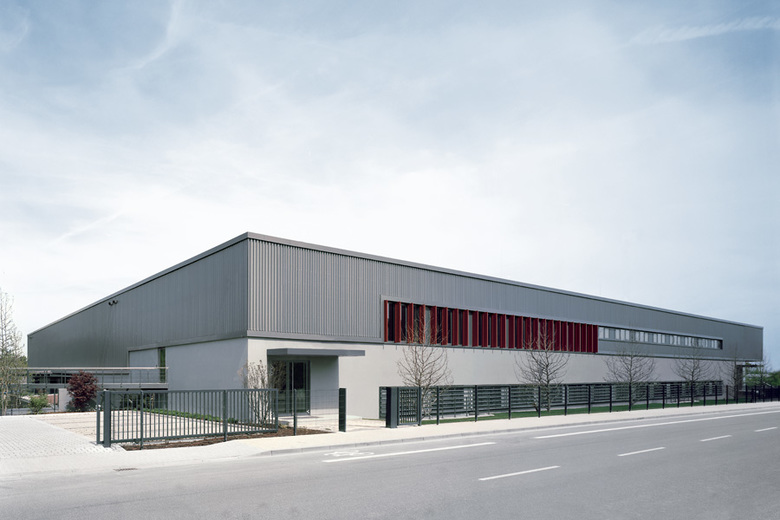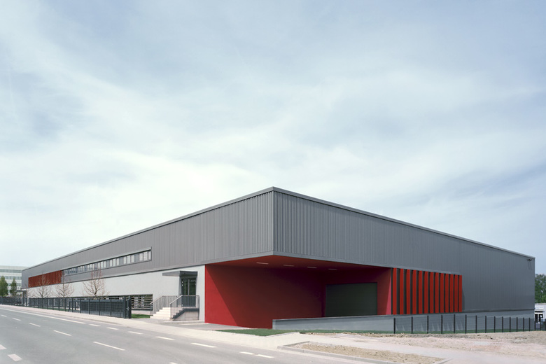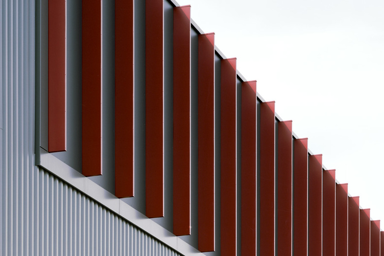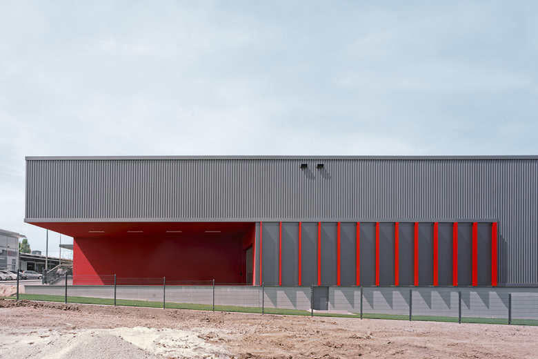 Die Halle ist als kompakter Baukörper mit gestaltprägenden Fassadeneinschnitten und -modulationen entworfen. Das große Bauvolumen wird in der Höhe in Sockel und Dach untergliedert. Der Sockel aus Betonfertigteilen dient als Fundament und Anprallschutz und ist nach außen hin glatt verputzt. Das Dach aus einer Holzleimbinder-Konstruktion spannt den Hallenraum über 30m auf und erhält eine Dachhaut und Fassade aus Trapezblech.Die grafitgraue Trapezblechfassade löst sich im Bereich der Einschnitte in vertikale Blechlammellen auf. Diese bespielen in ihrem auffälligen rot jede der vier Fassadenseiten, als Fenstergliederung, Vordachuntersicht oder einfach als Hingucker!