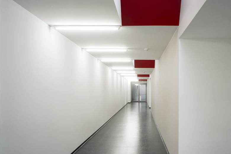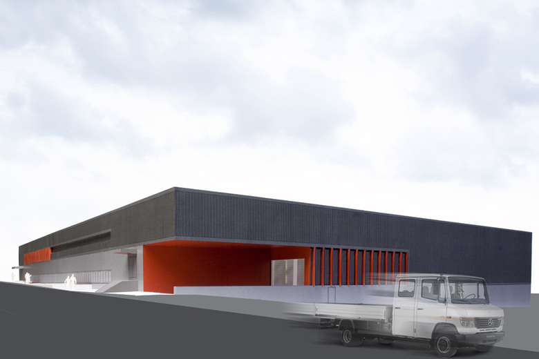 Die Fahrzeug- und Lagerhalle hat eine Grundfläche von 75m x 62,5m und ist für eine Lagerhöhe bis 7,5m ausgelegt. Der Hauptteil der Halle ist als eingeschossiger offener unbeheizter Lager- und Logistikbereich für 40 Kolonnenfahrzeuge geplant. In Verlängerung des bestehenden Bürogebäudes ist der Baukörper zweigeschossig mit der temperierten Spenglerei im Erdgeschoss und den Umkleide- und Sanitärräumen für die gewerblichen Mitarbeiter, sowie einem großen Pausen- und Versammlungsraum im Obergeschoss.