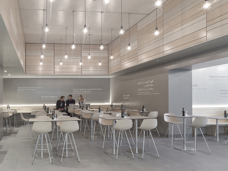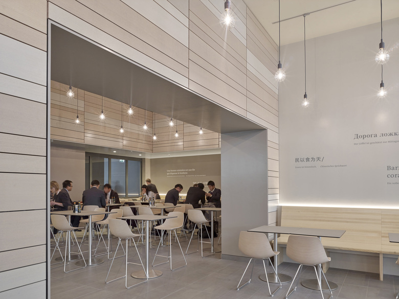 Im Halleninnern erhält der Gastraum ein hohes raumbildendes Deckenfeld mit einem Fries aus Esche-Paneelen. Die natürliche Holzverkleidung verleiht beiden Räumen eine freundliche und raumbestimmende Wirkung. Dieser Farbklang wird in den hölzernen Bänken und Sitzschalen und den grau- bis lehmfarbenen Wandfarben harmonisch abgerundet. 62 Pendelleuchten bespielen und belichten die neuen Gasträume für die Messebesucher.