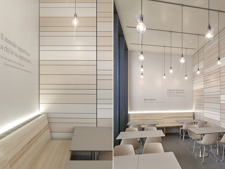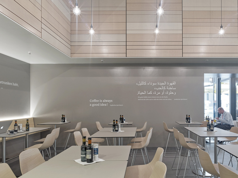 Die Fassadengestaltung aus naturgebrannten Keramik-Elementen mit großflächigen Portalen aus Betonfertigteilen setzt sich architektonisch in der neuen Café Bar fort. Der 5m tiefe Anbau wurde als ein gerahmtes Eingangstor aus Betonfertigteilen mit einer zurückversetzten Glasfassade ausgebildet. Die Rückwand des Anbaus nimmt mit farbig lasierten Esche-Paneelen die Struktur und Farbigkeit der Keramik-Fassade auf und wird - wie die Fassade selbst - zu einem monochromen Bild.