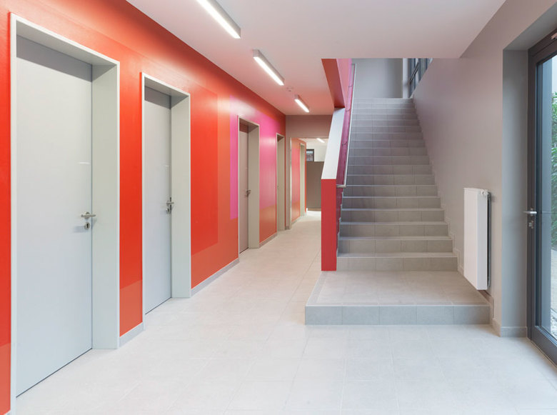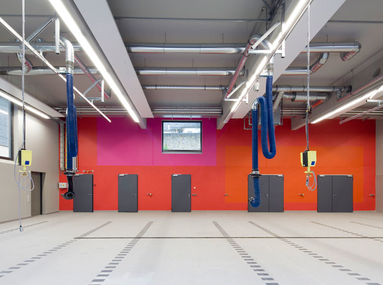Die Putzfarbe wirkt in ihrem ruhigen Mittelgrau wie die Mischfarbe der Nachbargebäude und trägt zur Einbindung in das städtische Umfeld bei. Gleich einer durchgegühten Kohle durch deren graue Ascheschicht vielfarbig und bewegt die Glut hindurch schimmert, leuchten durch die Fenster die Farben, der in Orange-Magenta-Rotflächen angelegten Innenwände. Das Zusammenspiel der gleichintensiven Farbtöne belebt die Innenräume und das auf Jugend angewiesene Vereinsleben der Feuerwehr.