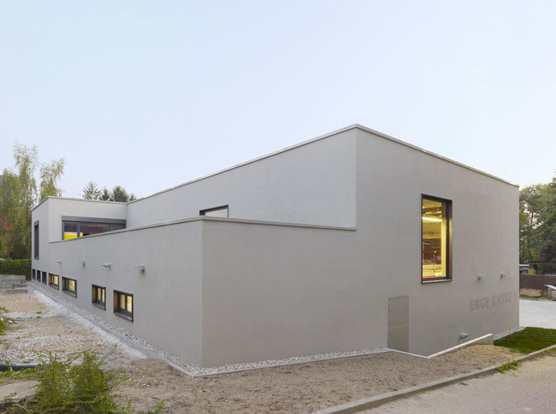 Der proportionierte und plastisch ausgebildete Baukörper lässt auf dem beengten Grundstück funktionale und qualitätvolle Außenräume entstehen. Der in das Volumen des Mannschaftsriegels eingeschnittene Eingang verleiht dem gesamten Gebäude einen skulpturalen Charakter. Diese Wirkung wird durch die flächige Fassade aus einem glatt verputzten Wärmedämmverbundsystem und der spielerischen Anordnung von sehr großen und sehr kleinen Öffnungen unterstrichen. Die Fenster lassen durch ihre Lage und Proportion interessante Innen- und Außenräume entstehen und werden zum maßgeblichen Gestaltungskriterium des einfachen Baukörpers. Durch die dunklen Blecheinfassungen erhalten sie im Detail ihre entwurfsbestimmte Wertigkeit.