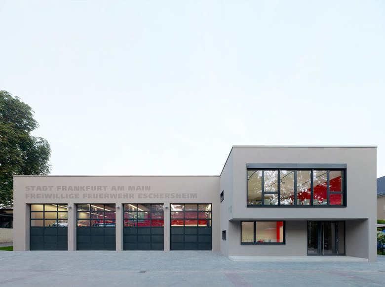 Die neue Feuerwache am Rande Alt-Eschersheims besteht aus einer Fahrzeughalle mit Nebenräumen (350 qm) und dem zweigeschossigen Funktions- und Vereinstrakt (420 qm). Ihr Standort ist dreiseitig umschlossen von einer gewachsenen Baustruktur aus Wohn- und Nutzgebäuden, im Westen grenzt das Grundstück an die unverbauten Niddawiesen.