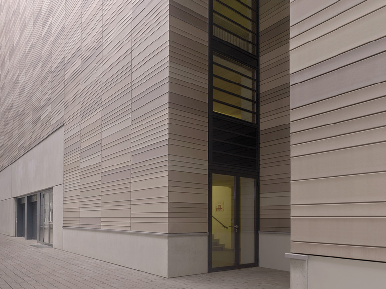 Die stadträumlich eingebaute Südseite ist auf Nahsicht angelegt. An ihr entlang verläuft eine fußläufige messeinterne Erschließungsachse. Naturgebrannte Keramikelemente in verschiedenen Farbschattierungen nehmen die Materialität und Farbigkeit der Umgebung auf und schaffen einen freundlichen und städtischen Raum für die Messebesucher. Das extra entwickelt Keramikprofil mit horizontalen Fugen und einer konkaven Krümmung belebt die flächige Wirkung der 3.500qm großen Keramikfassade.
