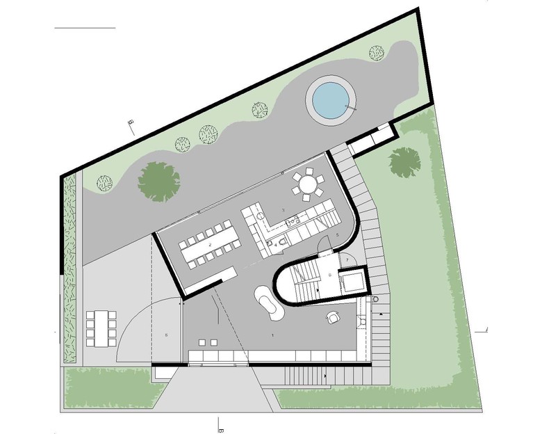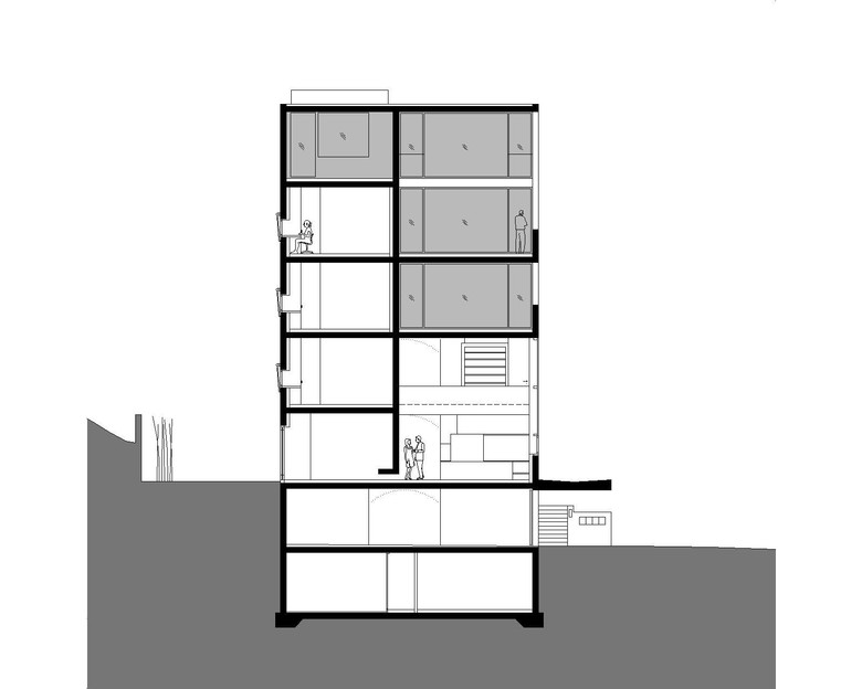 L’accesso alla casa avviene a fianco dell’entrata del posteggio coperto, tramite una scala che costeggia l’edificio sui lati est e nord. Il vano scala dell’edificio forma una rientranza all’interno del volume. Al pianterreno si accede al primo appartamento duplex. Attraverso il vano scala si accede al 2° piano all’appartamento di mezzo e al 3° piano all’appartamento duplex superiore. Il giardino è suddiviso in una parte comune e una parte privata, riservata all’appartamento al pianterreno. La parte comune e l’affaccio sulla strada riprendono piante e modalità dei giardini circostanti, mentre nella parte più privata si cela un giardino misterioso e selvatico, un microcosmo che dà respiro a tutto il duplex inferiore.