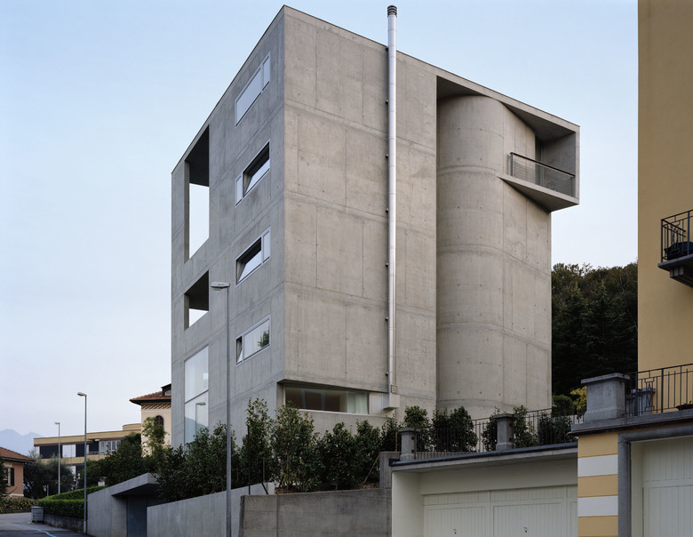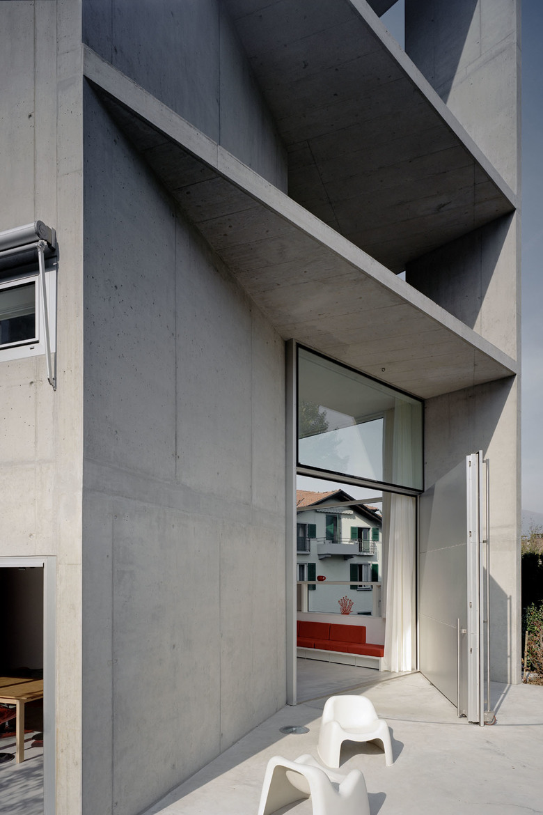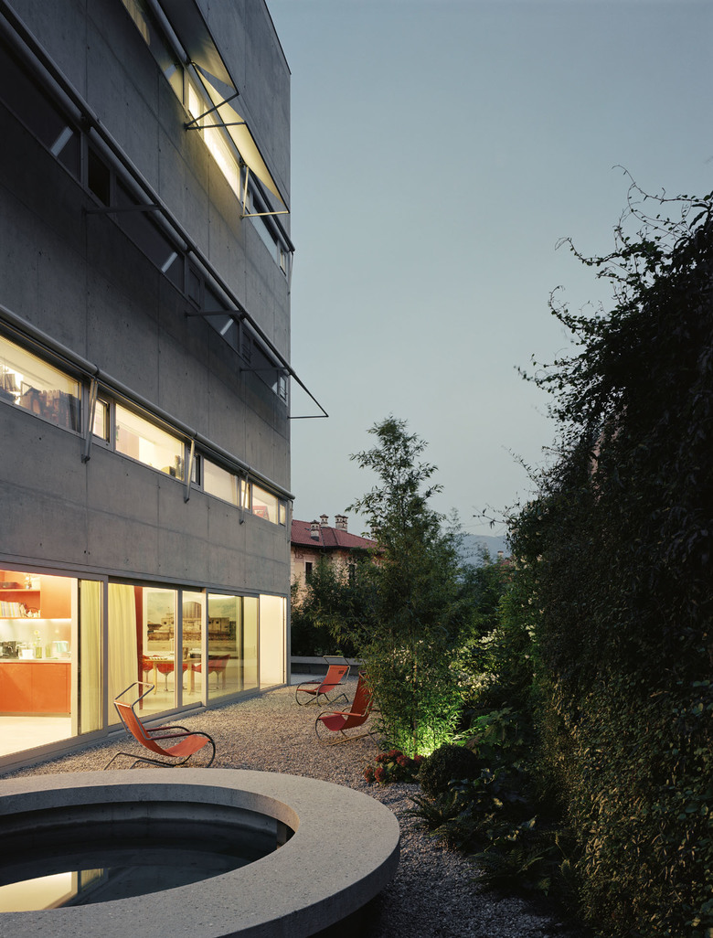 Dalla sovrapposizione di due case unifamiliari su una minuscola particella nasce una palazzina urbana, in cui a un’unità spetta la terra e l’estensione dello spazio interno nel giardino, all’altra il cielo e la proiezione verso la vista. Tra le due unità principali è inserito un appartamento ad un piano.La complessa geometria risponde alla forma della parcella, al sole e alla vista.