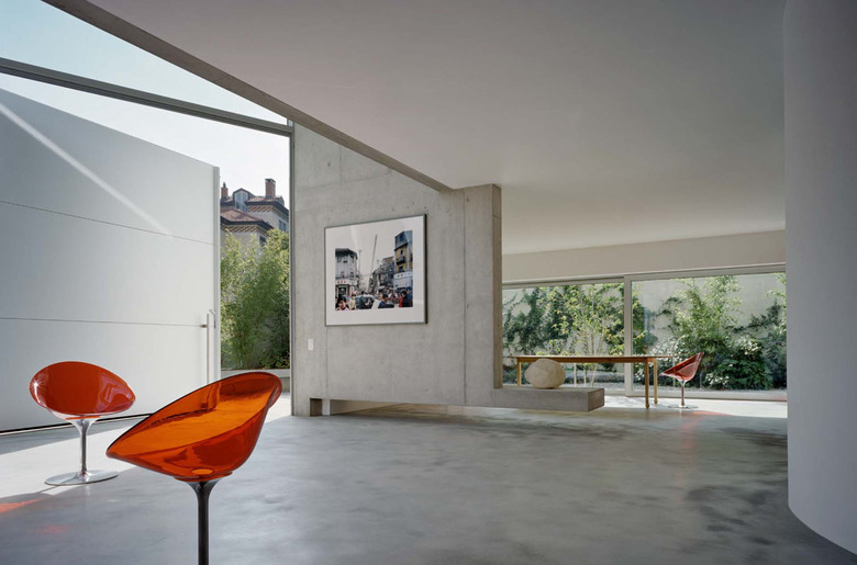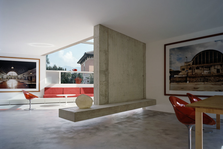 L’edificio, in cemento armato facciavista, viene isolato all’interno e rivestito da pareti e soffitti in cartongesso bianco. Lo spazio interno continuo è modulato da elementi divisori in legno colorato, dall’arancio al rosso al viola, che creano le nicchie delle stanze e dei bagni. I serramenti in alluminio incorniciano grandi aperture su viste lontane o vicine, le cime dei Denti della vecchia e del Generoso o il muro verde del giardino. I pavimenti in duratex sottolineano la continuità tra interno ed esterno.