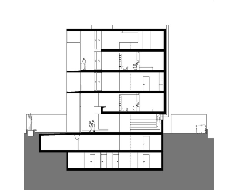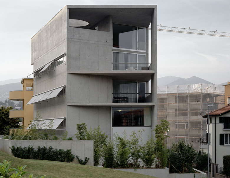 La parcella si situa a nord di una collina facente parte di una grande proprietà parcellata a partire dal primo Novecento. La via Bertoni risale a quell’epoca e funge da limite tra una zona di palazzine con giardino sorte lungo la strada attorno agli anni Venti e un’edificazione successiva, anni 1960-1980, di maggiore altezza e volume . L’edificio cerca di mantenere le caratteristiche del quartiere, formulando una versione contemporanea della palazzina residenziale con giardino. Il volume è compatto e si articola in parti incavate, logge e terrazze, che creano un rapporto con la strada, gli edifici circostanti, il sole e la vista.