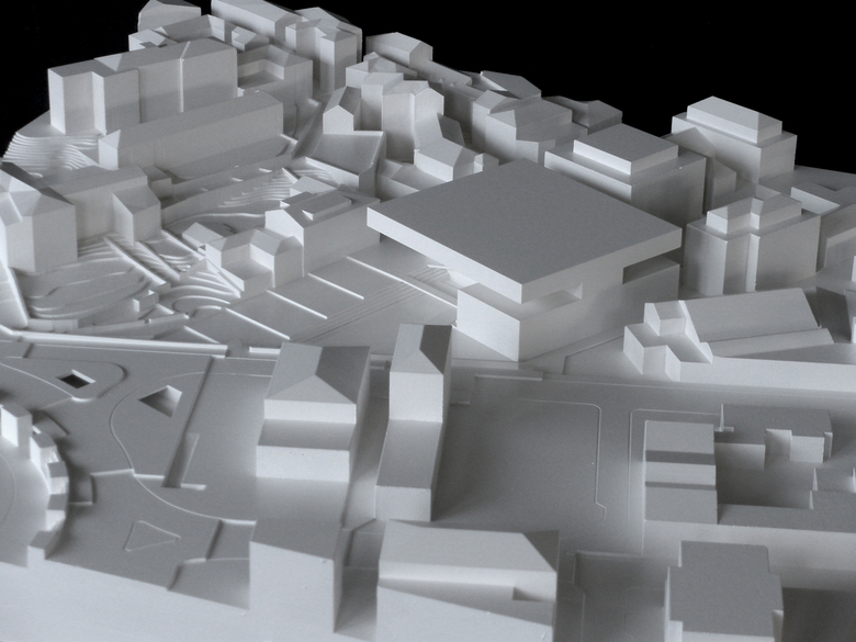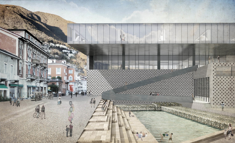 La città di Locarno è caratterizzata dalla sua Piazza, un vuoto delimitato dal fronte sinuoso del nucleo medievale al piede della montagna e, verso il delta, dalla geometria ortogonale del Piano Rusca. Verso est è delimitata dallo stabile della Posta che si affaccia sul parco e il Lago. Verso ovest, con il nuovo accesso dalla circonvallazione, richiede un corrispondente edificio di testa con il Palazzo del Cinema: il nuovo edificio si propone come contrappunto all’edificio della posta del Vacchini e elemento di raccordo con la magnifica rotonda, la nuova porta della città.