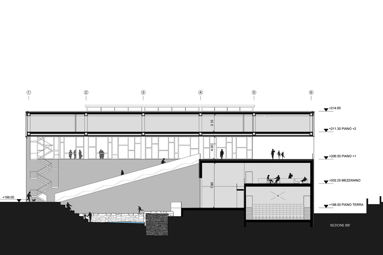 • Pianterreno: sito archeologico, raccordo con spazio pubblico e sale cinematografiche;