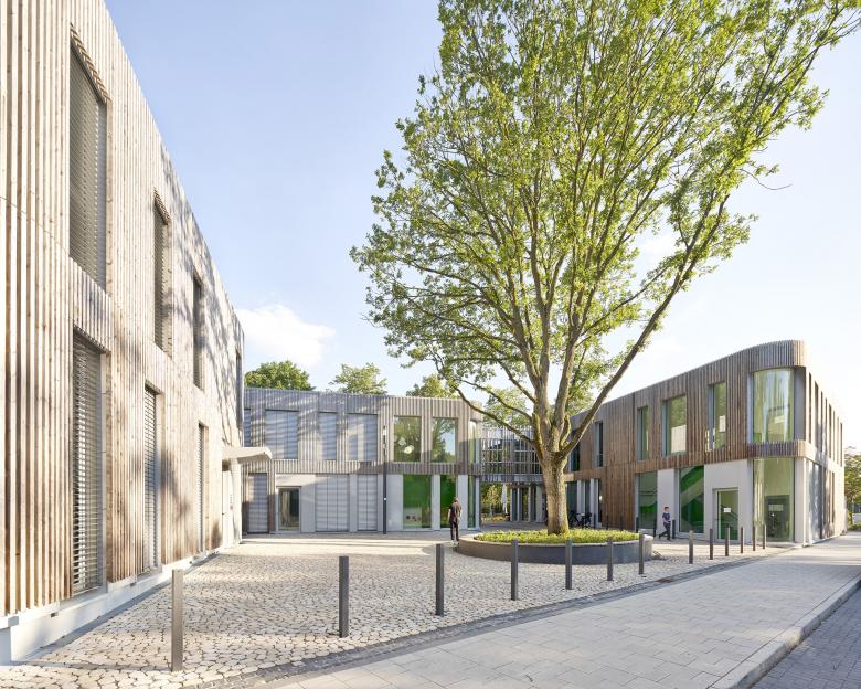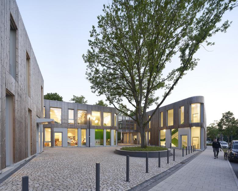 Drei der Neubauten sind südöstlich der Matthias-Erzberger-Straße um einen zentralen Platz mit einer alten ausgewachsenen Eiche angeordnet, wodurch eine dörfliche und heimische Atmosphäre entsteht. Die freistehenden Gebäude sind über Brücken im Obergeschoss miteinander verbunden und beherbergen das Pädagogische Zentrum, eine Kindertagesstätte sowie ein Mehrgenerationenhaus.