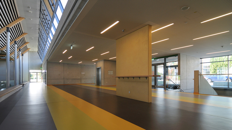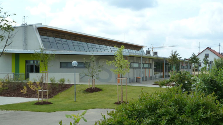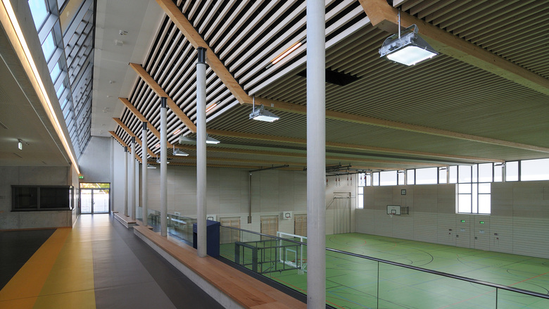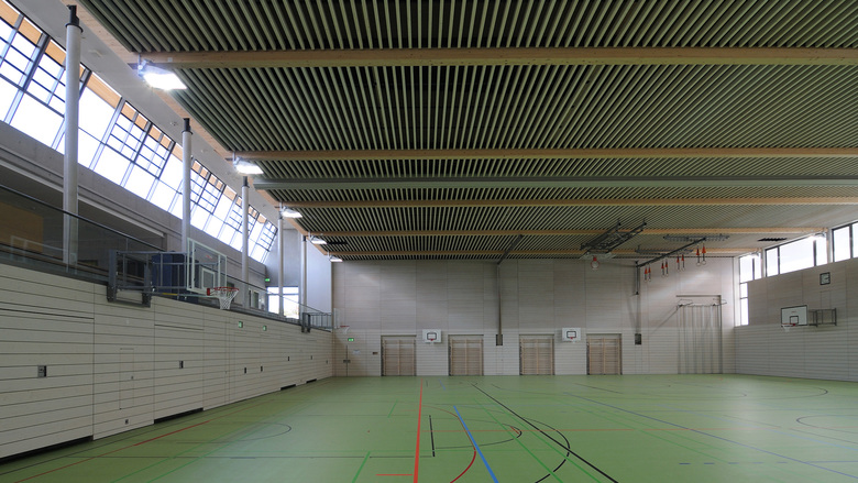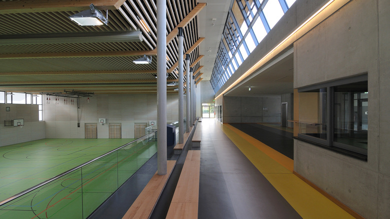 Neubau einer teilbaren 3-fach Sporthalle, die als Mehrzweckhalle für Schul-, Vereins- bzw. Veranstaltungszwecke genutzt werden kann. Das zu bebauende Grundstück hat von Nord nach Süd ein Gefälle vn ca. 2m. Die Sporthalle wird als teilversenkter, eingegrabener Baukörper mit einem zweigeschossigen Anbau (UG und EG) im Norden, mit den Abmessungen ca. B/L = 44,40/46,40m, einer Traufhöhe von ca. 7,30m und einer Firsthöhe von ca. 8,15m errichtet. Der ebenerdige Zugang zur Mehrzweckhalle erfolgt über einen Windfang ins Foyer mit beidseitigen offenen Treppenanlagen. Angrenzend an das Foyer liegt über die gesamte Spielfeldlänge eine abgetreppte Tribünenanlage mit einem zentralen Pultschrank für die integrierte Medientechnik. Die für die Veranstaltungsnutzung notwendigen Fluchttreppen aus dem Untergeschoss werden seitlich und unterhalb des Spielfeldes als aussenliegende Treppen angeordnet. Die Dachform des Gebäudes ergibt sich aus der geplanten natürlichen Belichtung der Sportstätte (Nord-Süd) als versetzte Pultdächer mit einem Gefälle von ca. 20 bis 30. Um eine blendfreie Belichtung garantieren zu können wird die Verglasung als Sonnenschutzglas mit integrierter Vlieseinlage ausgeführt. Die Halle ist auf dem Grundstück so positioniert, dass sowohl die Anbindung an die bestehenden Schulgebäude (Haupt-, Real- und Förderschule) optimal funktioniert, als auch die Führung der „Nutzerströme“ der Mehrzwecknutzungen. Durch die abgestimmte und detaillierte Planung und Anordnung der Sporthalle entsteht ein Baukörper, der sich nicht nur in die Umgebung integriert, sondern auch die Anwohner im Süden und Westen optimal vor Emissionen schützt.