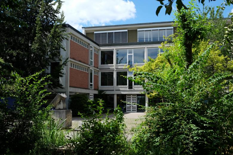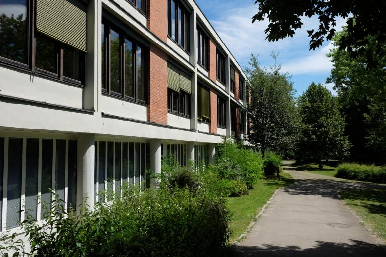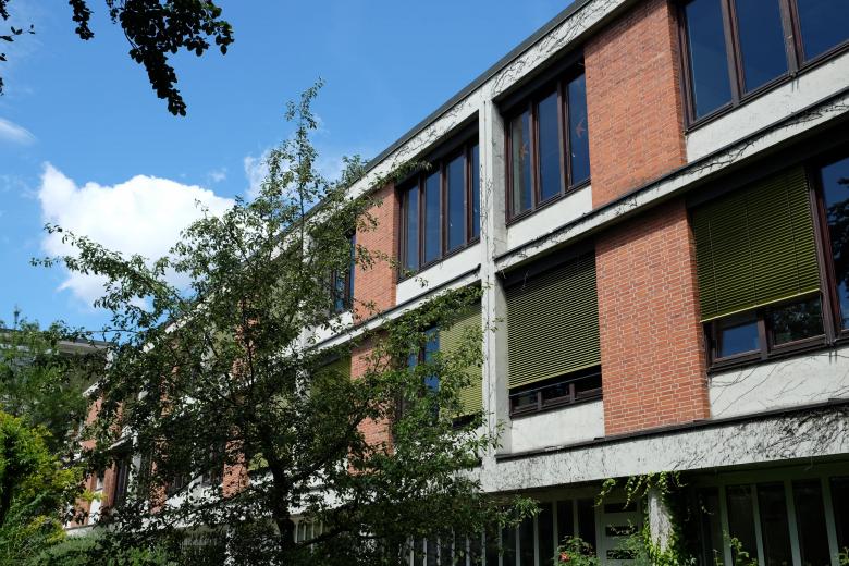 Das Schulensemble an der Wackersberger Straße in München-Sendling ist durch den Hauptbau des Gymnasiums aus dem Jahr 1958 geprägt.