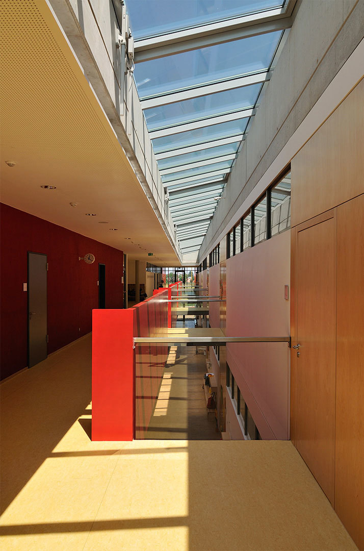 Der zweigeschossige Schulbaukörper wird stirnseitig über die große Pausenhalle erschlossen. Im Erdgeschoss ist der Kindergarten sowie die Mittags- und Nachmittagsbetreuung untergebracht. Die Verwaltung und die Unterrichtsräume befinden sich im Obergeschoss, welches durch Lufträume mit dem Erdgeschoss verbunden ist. Durch die Mehrfachnutzung wurde der Begriff „Kinderhaus“ eingeführt. Alle Klassenräume orientieren sich zum Biotop des Hachinger Baches. Die Sporthalle liegt westlich der Schule und ist in ihrer halben Bauhöhe eingegraben und über das Untergeschoss baulich mit der Schule verbunden. Hier befinden sich die Umkleiden sowie Nebenräume und Technik. Der gesamte Schulkomplex liegt parallel zur östlich angrenzenden Wohnbebauung und zu dem Grünzug des Hachinger Baches. Auch die Pausenflächen öffnen sich mit ihren vielfältigen Erlebnisräumen zu dieser Grünfläche. Der Baukörper wurde in einer Stahlbeton-Stützenkonstruktion errichtet. Die Dachflächen sind extensiv begrünt. Das Sporthallendach ist eine Stahlkonstruktion mit Brettstapel-Akustikdecke und gleichfalls extensiver Begrünung als Ausgleich zur Flächenversiegelung. Energetische Optimierung: EnEV 2007: - 30% und Hackschnitzelheizung