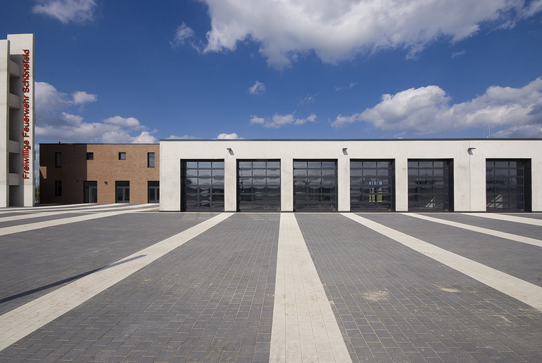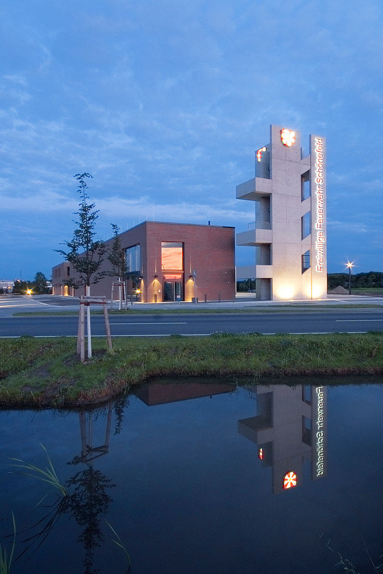 Das Raumprogramm beinhaltet eine Fahrzeughalle mit insgesamt 8 Toren, die jeweils zugehörigen Nebenräume wie Lager, Schulungs- und Büroräume, Ruheräume u. Jugendwehr sowie einen 20 m hohen Übungsturm mit 4 offenen Übungsebenen. Die Fassaden wurden wartungsarm zweischalig ausgebildet, Fahrzeughalle u. Übungsturm in Sichtbeton, die Gebäuderiegel der Nebenflächen als Klinkerfassaden. Der 19 Meter hohe Übungsturm wirkt zugleich als Signet und weithin sichtbare Landmarke.