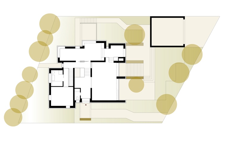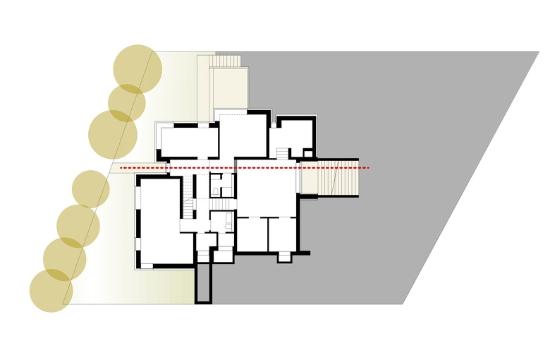 Wir trafen auf einen klassischen Bungalow in Hanglage aus den 70iger Jahren, eine durchdachte und abwechslungsreiche Grundstruktur aus Mauerwerks- und versetzt angeordneten Deckenscheiben. Dieses Gefüge war jedoch durch zahlreiche Einbauten überformt und seiner vermutlich ursprünglichen Klarheit und Leichtigkeit beraubt. Insgesamt wirkte das Haus ein bißchen aus der Zeit gefallen, kühl und düster.