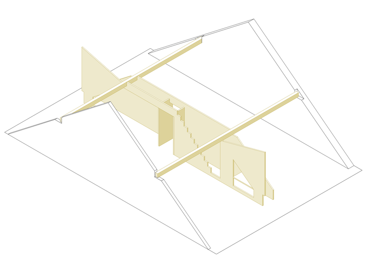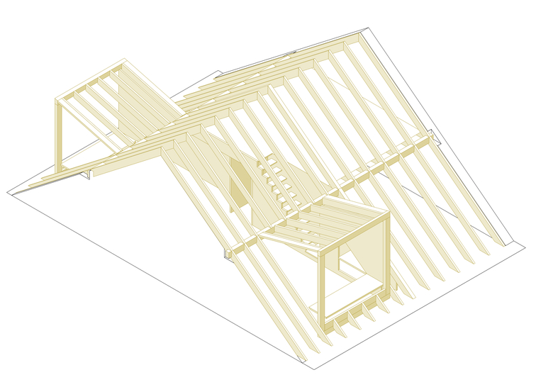 Zwei in der Werkstatt vorgefertigte, in Gebäudemitte angeordnete Wandscheiben aus Furnierschichtholz- tafeln werden konstruktiv, räumlich und funktional zum Rückgrat der neuen Dachkonstruktion: