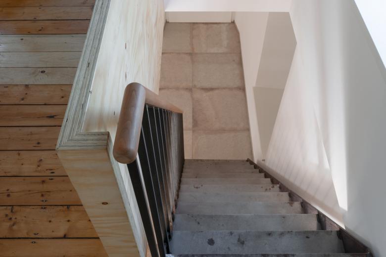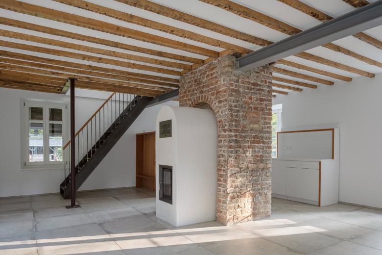 Eine neue Bodenplatte hob das Erdgeschossniveau an, trennte den Keller vom Erdgeschoss und schuf die Grundlage für eine fachgerechte Abdichtung. Man eliminierte die Holzkonstruktionen im Erdgeschoss, leitete Lasten aus Decke und Obergeschoss auf die massiven Außenwände und neue sichtbare Stahlelemente ab und ersetzte die zerstörte Holztreppe durch eine Stahlstiege. Mineralische Materialien an Wänden und Böden ermöglichen einen Mindestwärmeschutz aber auch eine verläßliche Austrocknung bei künftigen Überflutungen. Technische Einrichtungen wurden ins Obergeschoss verlagert, notwendige Leitungen im Erdgeschoss „auf Putz“ verlegt.