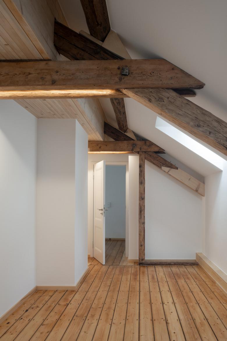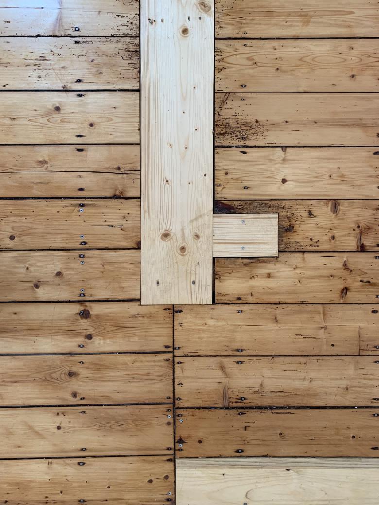 Schäden in den bestehenden Holzkonstruktionen wurden durch Holzprothesen behoben, der Dielenboden durch passgenaue Einfügung neuer Hölzer ergänzt. Spuren der Reparaturen bleiben im gesamten Gebäude sichtbar.