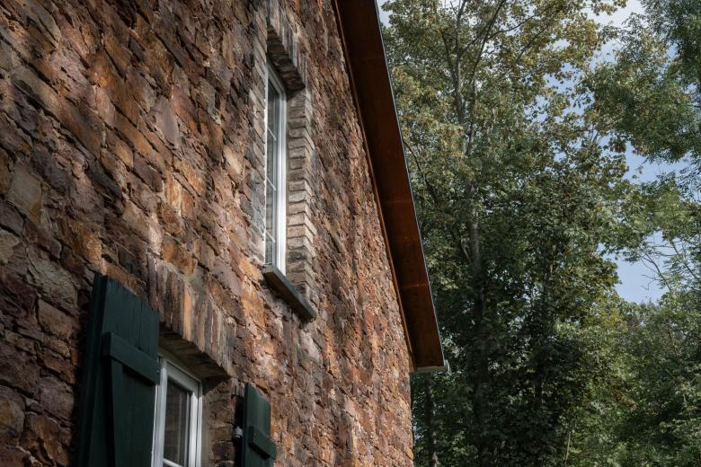 Die Gebäudehülle blieb unverändert, Schäden am Mauerwerk wurden fachgerecht repariert, das neue Dach durch sorgfältige Detailausbildung der Dachränder maßstabsgerecht auf den Mauerwerkskubus abgestimmt, die Fenster blieben erhalten.