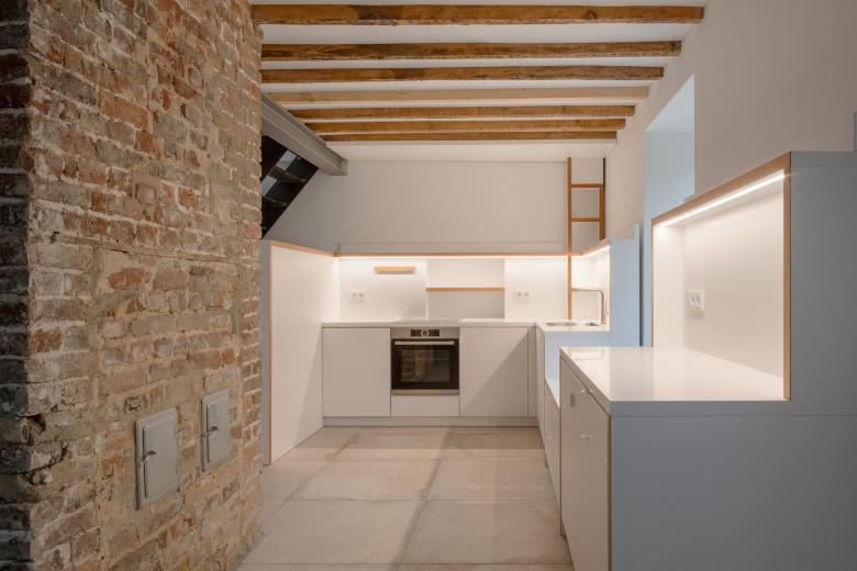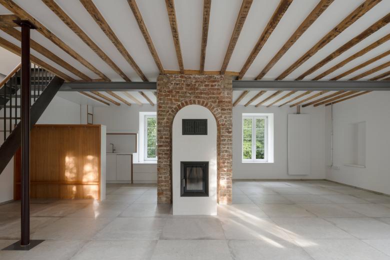 Im Erdgeschoss entstand ein Einraum, der durch den mittig gesetzten Kamin in verschiedene Zonen unterteilt wird. Die Küche befindet sich in einer dieser Zonen und lässt den restlichen Raum offen für flexible und im Flutfall schnell demontierbare Möblierung. Im Obergeschoss entfernte man die Zwischendecke zum Speicher, wodurch die Dachkonstruktion freigelegt und die Räume höher und großzügiger wurden.