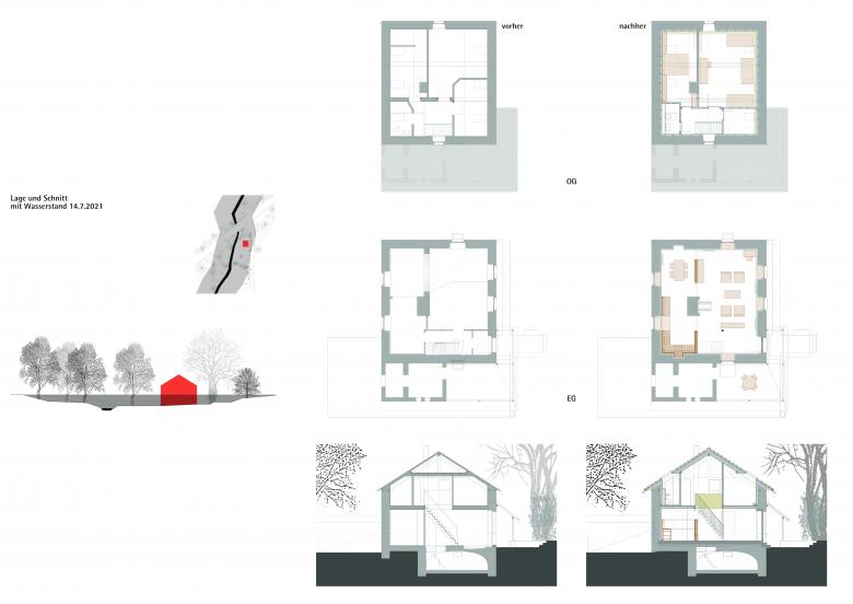 Da zukünftige Überflutungen nicht ausgeschlossen werden konnten, stand sogar ein Abriss des Gebäudes zur Debatte. Doch konstruktive und gestalterische Vorsorgemaßnahmen überzeugten den Bauherrn, das Bauwerk zu erhalten und grundlegend zu sanieren.