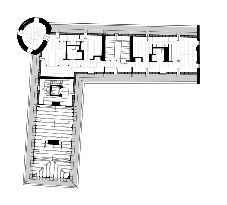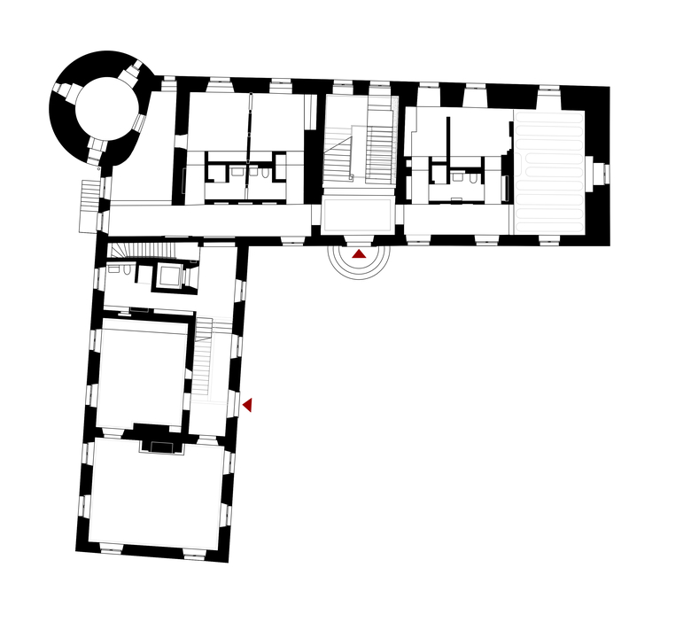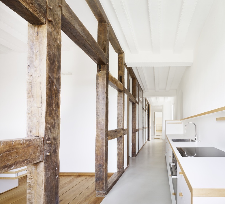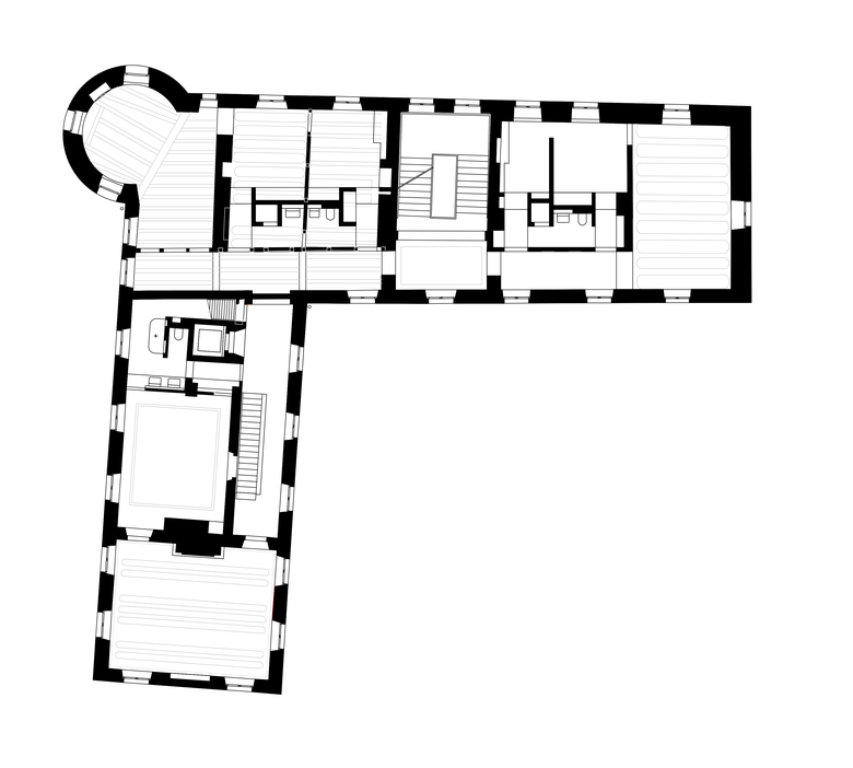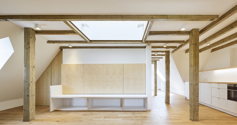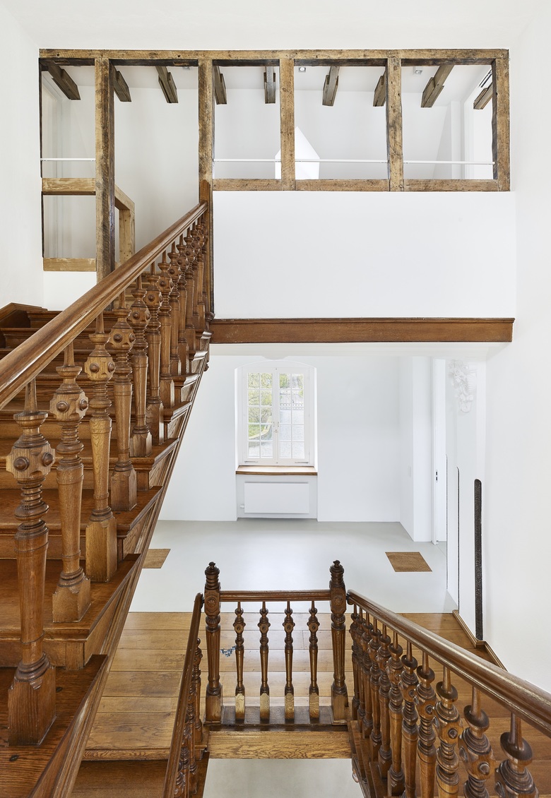 Unter Ausnutzung des denkmalgeschützten und räumlich überaus vielfältigen Bestandsgefüges wurden die Wohnungen nach dem Grundsatz entwickelt, nach dem eine gute Wohnung wie eine kleine Stadt funktionieren sollte: die Funktionsbereiche werden durch vielfältige Wege- und Blickbeziehungen durch die abwechselnd weiten und engen Räume der Wohnungen miteinander verknüpft.