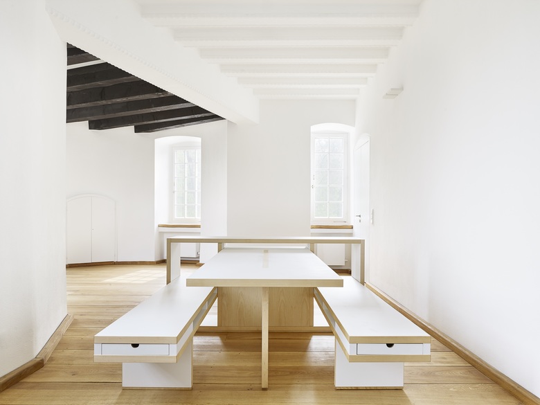 Respektvoller und fachgerechter Umgang mit den vielfältig modellierten Wänden, Decken und Böden aus dem Bestand, präzise Fügung und Einfügung von neuen Bauteilen, sensibler Einsatz von Materialien und deren Oberflächenbearbeitung und sorgfältige Führung von Kunst- und Tageslicht charakterisieren die Räume in der Burg Bachem nach dem Umbau.