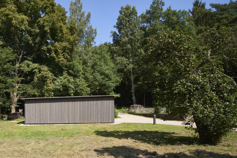 Das neue Garagengebäude ist als einfacher, flacher, und scharf konturierter Holzkubus ausgeführt und so positioniert, dass die Zufahrt räumlich gefasst wird, das Bestandsgebäude jeodch nach wie vor frei in der Wiesenlandschaft stehend zur Geltung kommt.
