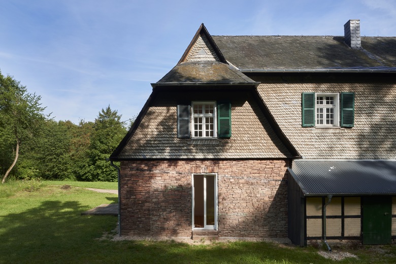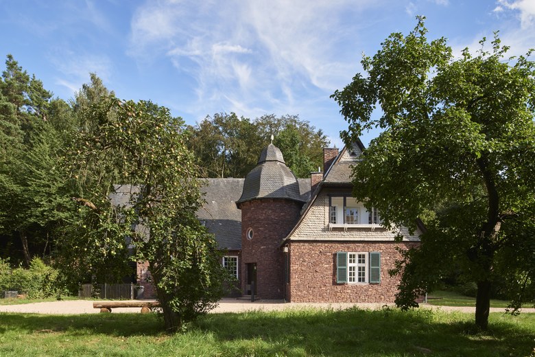 Die hellen, leicht ins rötliche tendierenden Hölzer prägen nunmehr das Innere des gesamten Hauses. Die Originaltüren wurden überwiegend wiederverwendet, aufgearbeitet und weiss lackiert. Bruchsteinmauerwerk aus Buntsandstein, Schiefer und frisch sanierte Holzfenster und -bekleidungen dominieren dagegen wei- terhin das äußere Erscheinungsbild des von seinen Anbauten befreiten Gebäudes