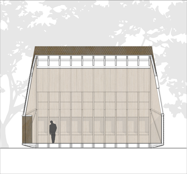Il manufatto – lungo circa 11,00 m, alto 8,00 m, sorretto da undici portali in legno lamellare che definiscono dieci campate - si configura sostanzialmente come una copertura a falde dalla proporzione verticale enfatizzata, caratterizzata da un rivestimento continuo in scandole lignee interrotto solo dalla presenza di una serie di lucernari triangolari filofalda posti su entrambi i lati.